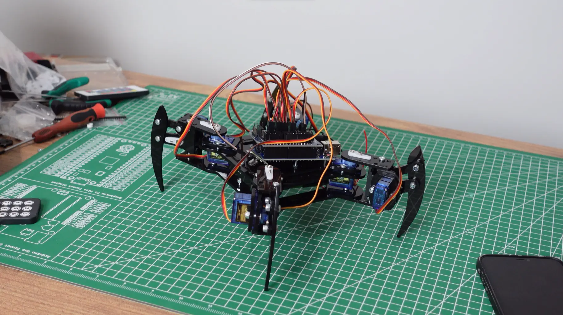 Robotu montaj olduktan sonra videonun 7.02 – 8.59 arasında test süreci izleyebilirsiniz. 4 bacaklı yapısı sayesinde ileri, geri, sola ve sağa yürüme hareketlerini yapabiliyor. Hareket kontrolü bluetooth bağlantısı ile mobil cihazdan sağlanıyor.