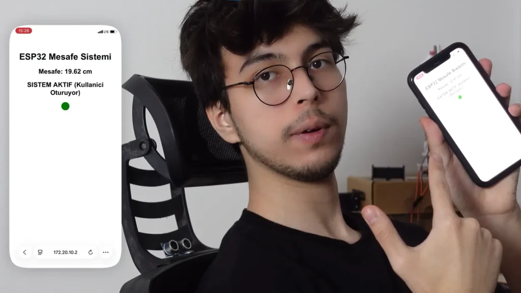 Hazırladığımız sistemi sıradan bir ofis koltuğunun boyun desteğinin altına yerleştirdik. Sistem, oturan kişinin boyun mesafesini sürekli ölçüyor. Kişi öne doğru fazla eğildiğinde sensör bu değişimi algılıyor ve aktif buzzer yardımıyla uyarı vererek tekrar dik pozisyona dönmesini sağlıyor. Üstelik proje yalnızca fiziksel bir uyarı sistemiyle sınırlı kalmıyor; ESP32’nin Wi-Fi özelliği sayesinde anlık mesafe bilgisi ve sistem durumu web arayüzü üzerinden de takip edilebiliyor.