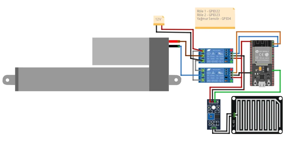 Bu bağlantı yapısı sayesinde sensörden gelen veri doğrudan ESP32 tarafından okunur ve gerekli olduğunda röleler tetiklenerek aktüatör hareket ettirilir.